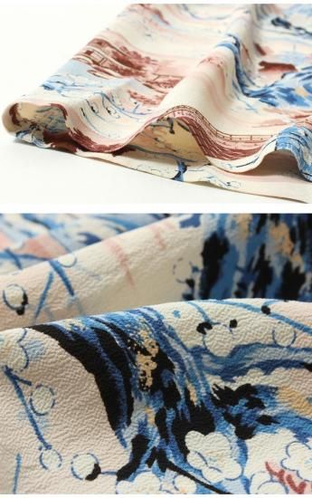 経糸にレーヨン無撚糸、緯糸に凹凸の表面をもつレーヨン壁糸を使用し外観を縮緬(ちりめん)に似せた素材で、元は和装用の布地として開発された素材のため、和柄のアロハシャツとの調和が抜群です。