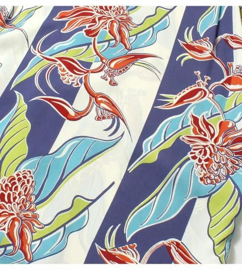 「モチーフとなっているのはショウガ科の多年草であるトーチジンジャー。ハワイでの歴史は古く、自生しやすい気候であることから島のいたるところで咲き、人々を楽しませている。アロハシャツのデザインとしても初期の頃から見られ、長きにわたり人気のモチーフとして採用され続けてきたハワイを代表する植物のひとつと言えよう。今回復刻したこの作品はボーダー状に区切られたグランドにトーチジンジャーを置き、さらに色で切り替えた斬新なデザイン。カメハメハ・ガーメント社の柄に対しての強いこだわりが伝わる一枚となっている。」